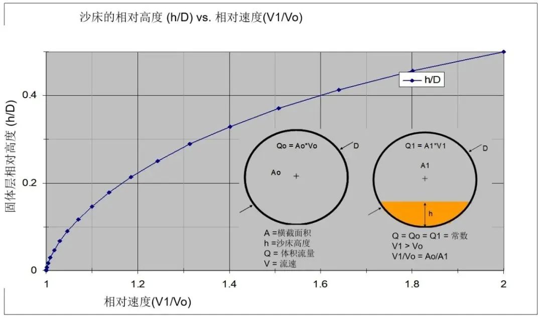 如(rú)果管道(dào)中已經形成穩定的沉積沙床,不移動的沙床導致管道內橫截麵積減小,因此沉積上方的(de)礦漿(jiāng)流速會加快,流速(sù)增加和沉積高度的線性關係(xì)如上圖所示,這時(shí),可以根據聲呐流量計測量的增加的流速對沉積高度進(jìn)行估算,注意該數據無法絕對準確,更加合理的方法(fǎ)是提高輸送速度,避免沉積現象出(chū)現。