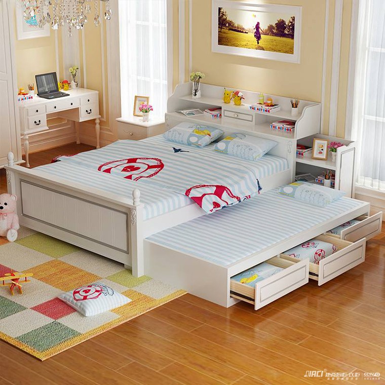 實木的可以選擇鬆木製作的。鬆木比較結實,是純實木(mù)家具(jù),有天然木(mù)香味道,結實、穩(wěn)固。外部(bù)大多刷塗清漆,甲醛含量較少。但實木子母床顏色單一,較笨重,不易搬運。價格相對板材子母床來(lái)說也(yě)要高一些。